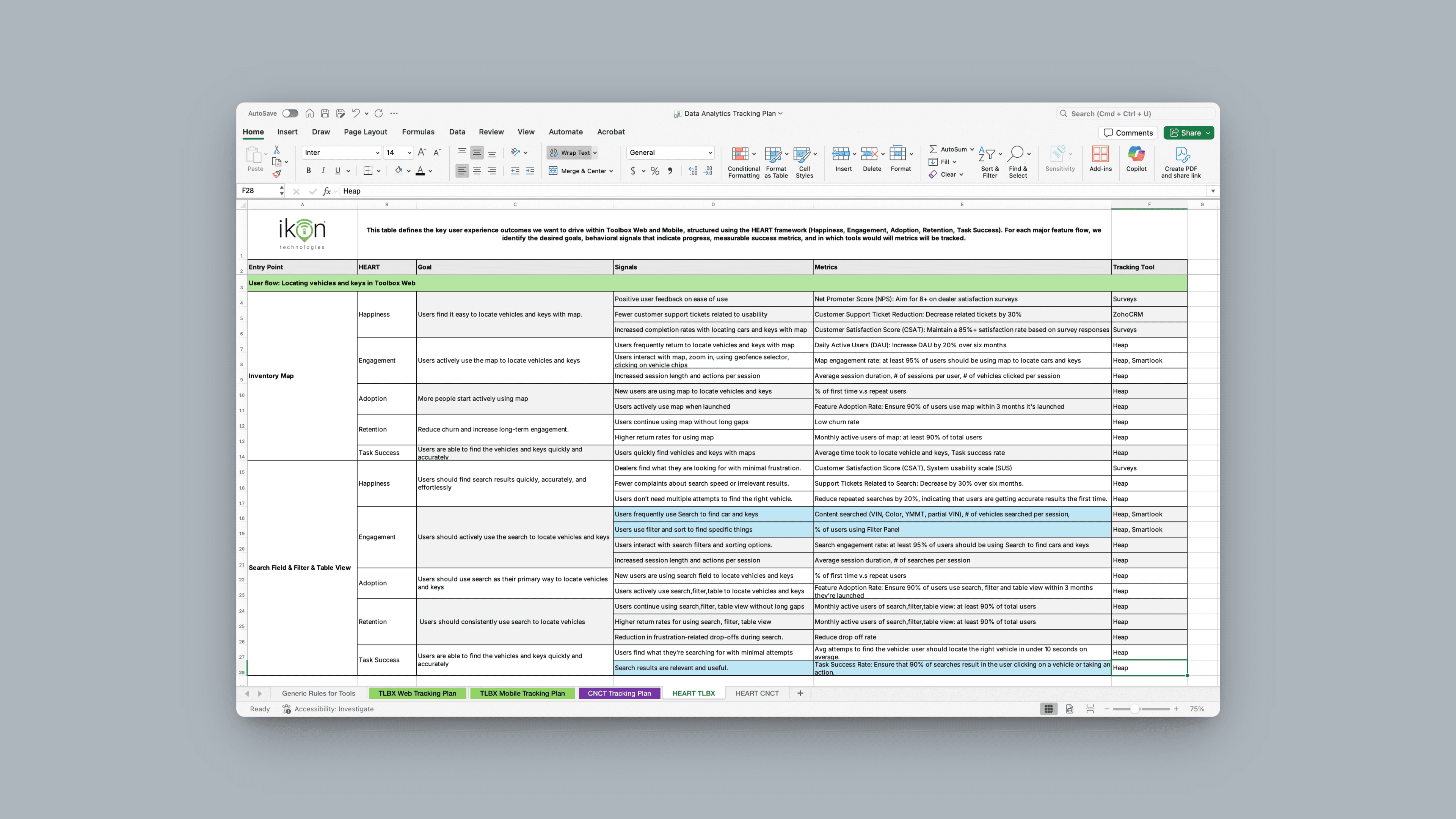 I collaborated with a Senior PM to define how we measure product success before launching. We aligned on the HEART model (inspired by Google) as the north star for how we evaluate product health. I then mapped every major workflow (mobile + web) into measurable touchpoints in Google Sheets and collaborated with engineering to instrument these events in Heap, Smartlook, and Google Analytics — ensuring we captured both quantitative behavior and qualitative context.