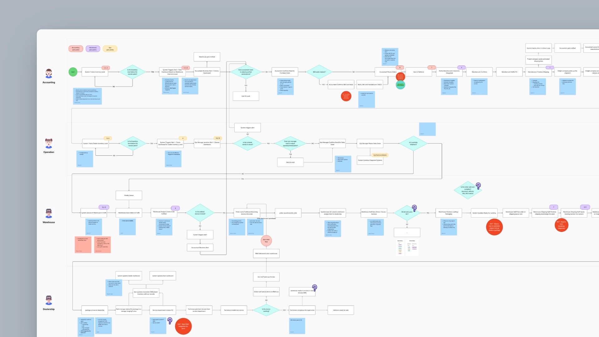 I led cross-functional discovery with leadership and operations teams to map the end-to-end lifecycle of a device — from manufacturing to warehouse, to dealership, and ultimately activation. I collaborated with another PM to define the business rules and workflow systems map, along with the data flow across HubSpot → NetSuite → Zoho. This became the single source of truth for how decisions and informations actually moved across the systems.