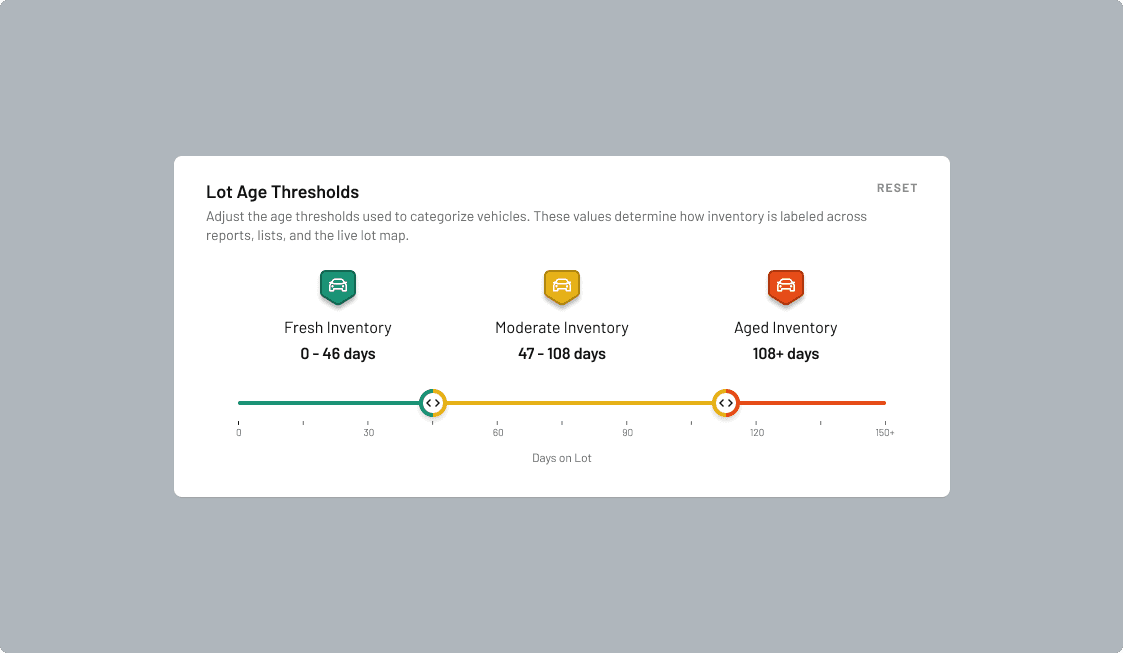 I enabled dealers to set their own aging thresholds based on how their lot actually operates, not a one-size-fits-all rule. Dealers could define what “aging risk” meant for their market, turning aging tiers from a static indicator into an adjustable lever they could use for acquisition, pricing, and inventory strategy. This made aging not just a visualization — but a strategic control that actually changed dealer behaviour.